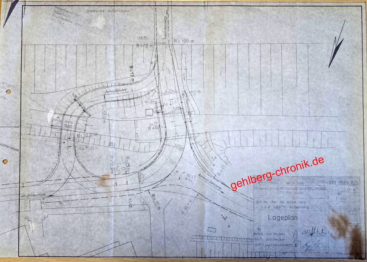 Am 16. Mai wurde die Rekonstruktion der Brücke über die Gera (am Tunnel vor dem Glöckchen) für 1986 angekündigt. Die Abb. 1985-020 zeigt die während der Bauarbeiten geplante Straßenführung. 30)
