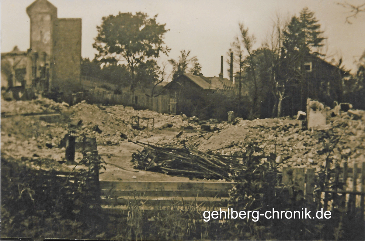 Abb. 1945-015Blick von der Einmündung Schmückerstraße/Hauptstraße auf die Trümmer der Villa und einen Mauerrest der Fabrik |