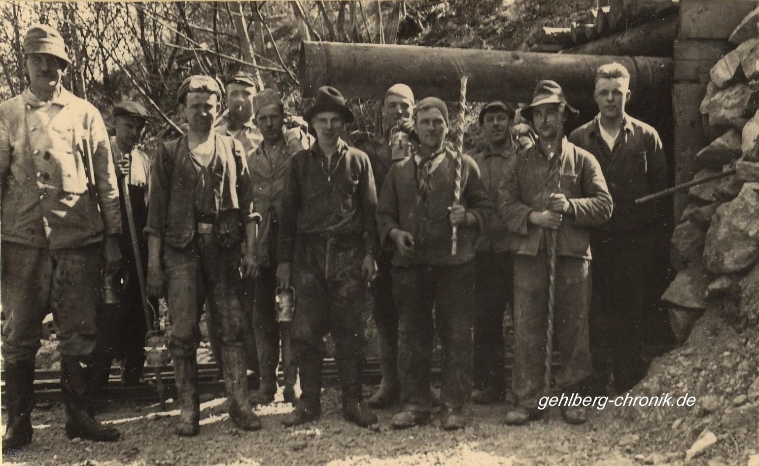 Abb. 017Bergleute der Braunsteingrube "Volle Rose" im Tal der "Zahmen Gera" unterhalb des Trogwegs (Bild Anfang 1936); links Bernhard Senf ⇒(EA098) |