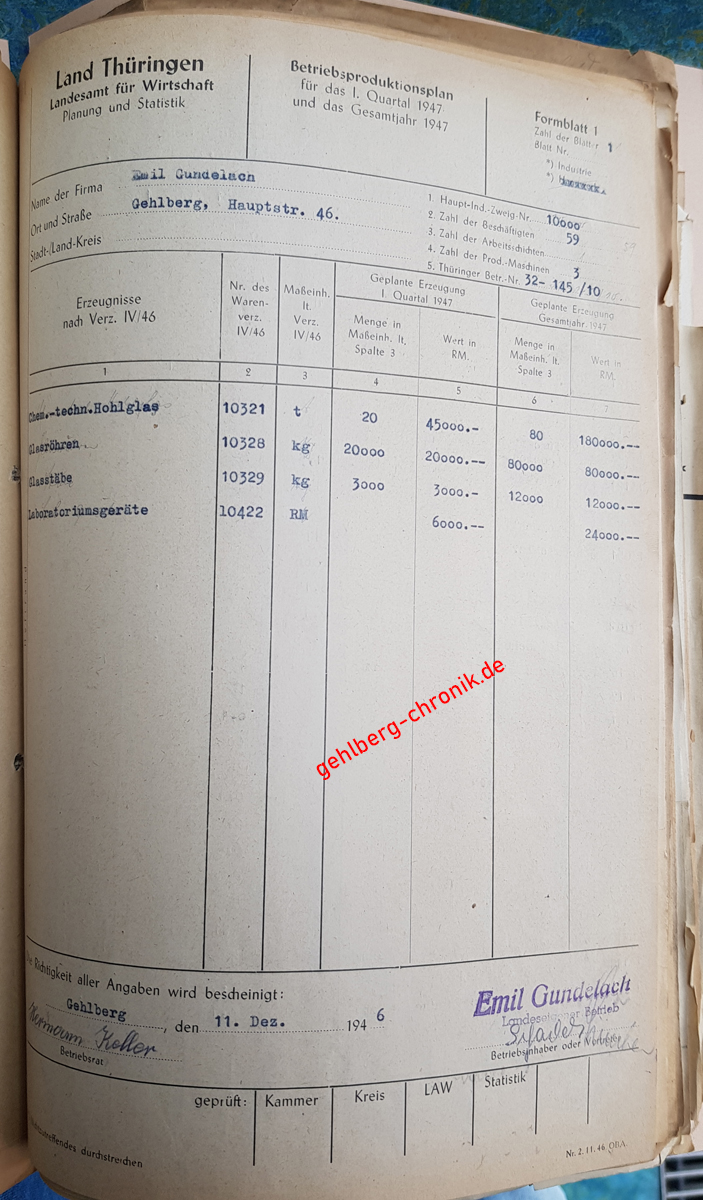 Mehrfach wurden „Fertigungslisten“ abgefordert. Neben den erzeugten Produkten wurden darin auch die eingesetzten Rohstoffe aufgelistet. Exemplarisch wurde die der Firma Gundelach(zu diesem Zeitpunkt landeseigener Betrieb) beigefügt. 13)
