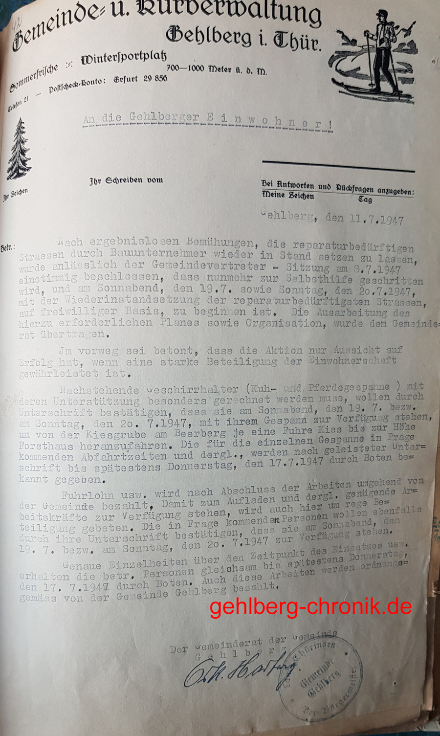 Gehlberg war bei der Ablieferung von Getreide (Befehl 60 der SMAD) mit 6 Zentnern unter der Vorgabe geblieben. Die Ursachen dafür waren Druschverluste und hohe Feuchtigkeit. Aus diesem Grund bat man alle, welche nicht der Abgabepflicht unterlagen, aber ein Druschergebnis über 50 kg hatten, um eine freiwillige Abgabe zwecks Defizitausgleich.12)