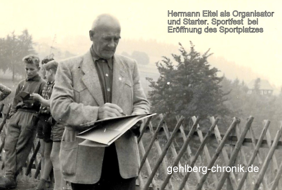 In der Gemeindevertretersitzung vom 15. April war die Gehlberger appelliert worden, sich an der Fertigstellung des Sportplatzes zu beteiligen. Dieser sollte bis zum 01.05. planiert und bis 15.07. fertiggestellt sein. In der selben Veranstaltung kamen Vorstellungen des Schulleiters Schramm zur Sprache, nach dem Auszug des Kindergartens aus der Schule in dieser ein Lehrerzimmer einzurichten. Die Gemeinde beabsichtigte, Edwin Ludwigs ehemalige Garage als Lager zu benutzen.22)