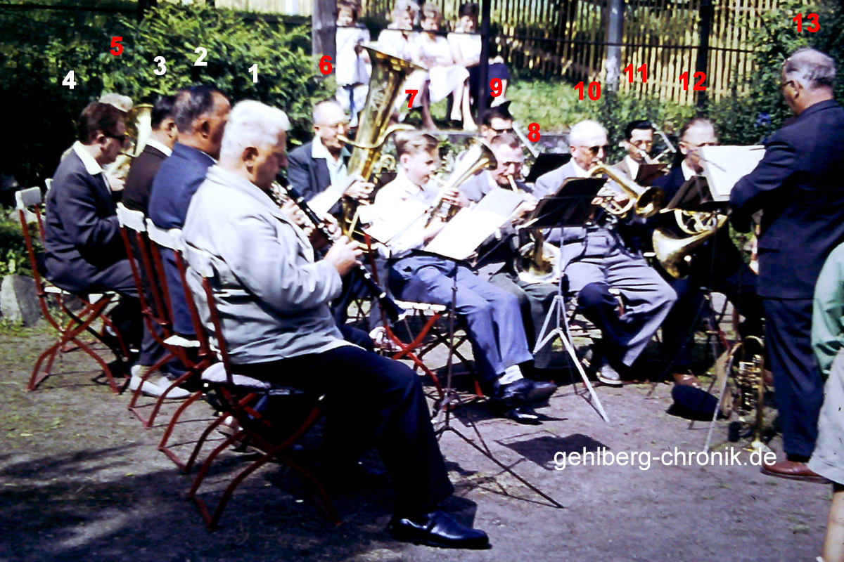 Die Blaskapelle spielt im Kurpark. 1 Erwin Greiner⇒ Feder, 2 Emil Machalett (Bergschulz), 3 ?, 4 Wolfgang Straube, 5 August Machalett, 6 August Greiner ⇒ Feder(Audut), 7 Erhard Schmidt, 8 Lapp, 9 ?, 10 Albert Straube, 11 Horst Griebel (Zaro), 12 ?, 13 Heinz Lapp