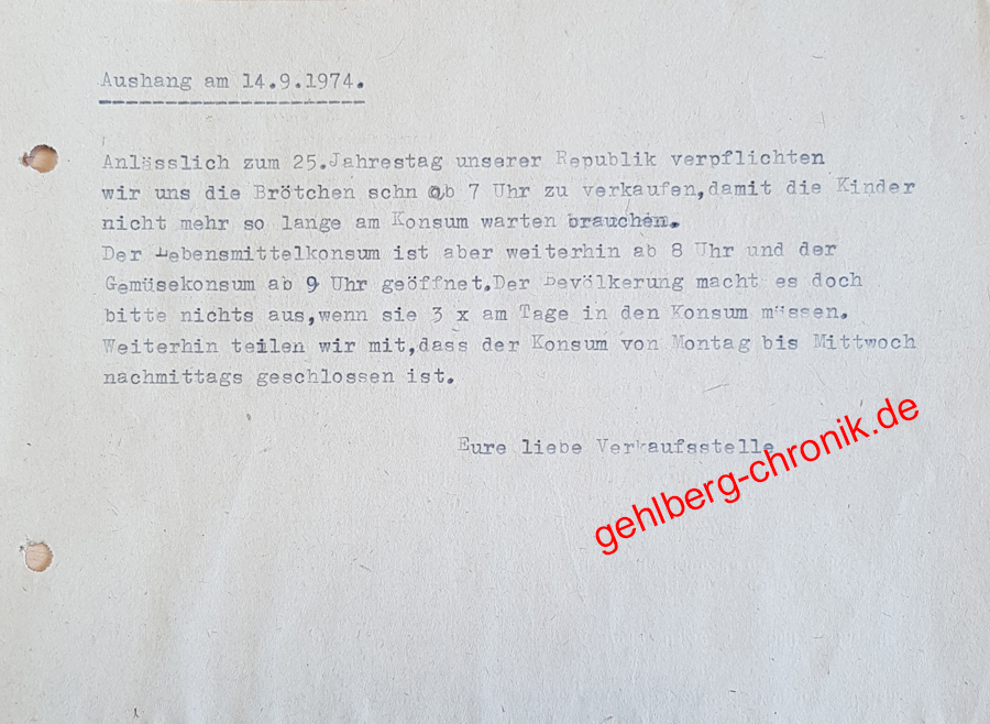 Am 14.09. war ein anonymer Aushang am „Schwarzen Brett“ des Ortes. Ganz offensichtlich hatte da jemand seinem Ärger über die wenig kundenfreundlichen Öffnungszeiten des Konsum Luft gemacht.4)