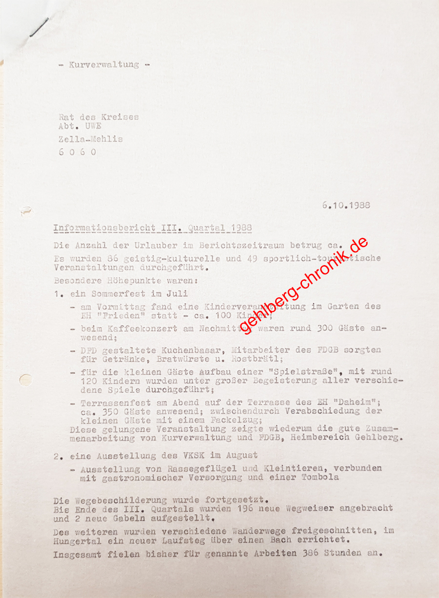 Am 06.10. lieferte die Kurverwaltung ihren Bericht zum III. Quartal an den Rat des Kreises Suhl (siehe Abb. 1988-001 und 002).15)