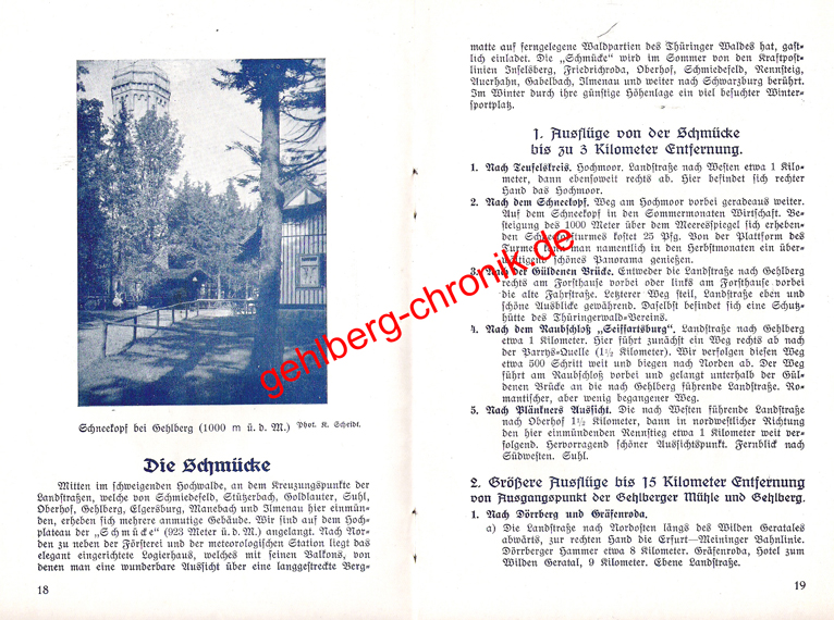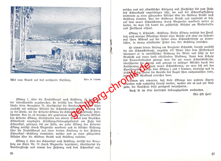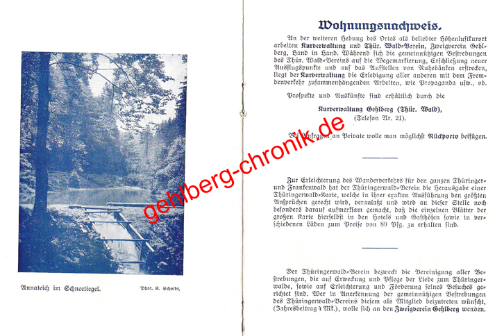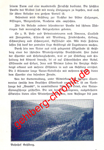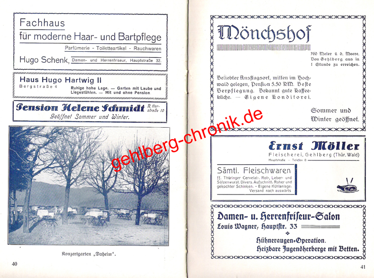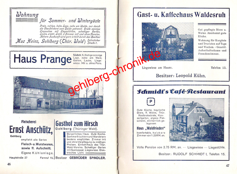 Das Prospekt des Thüringerwald-Vereins Gehlberg in seiner 5. Auflage dürfte frühestens 1932 entstanden sein und längstens bis 1937 vertrieben worden sein. Dies lässt sich anhand der in diesem enthaltenen Anzeigen so datieren (Friseurgeschäfte Schenk und Wagner waren erst ab 1932 in der Hauptstraße 34 bzw. 33; Tuchhandel Schmidt war ab 1938 in der Hauptstraße/Hindenburgstraße 12).