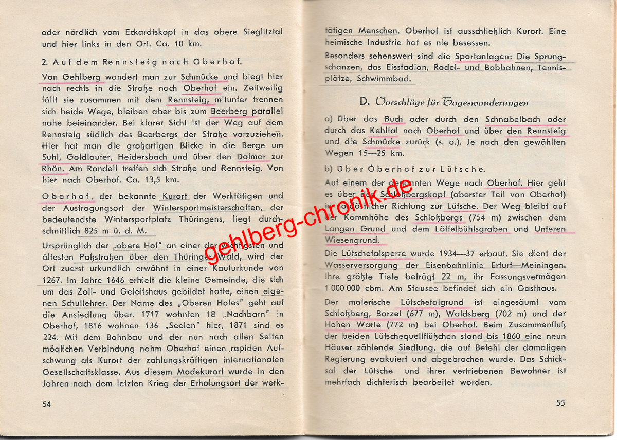 Dieser Wanderführer dürfte Mitte der 1950er-Jahre entstanden sein. Der Name des Besitzers dieses Exemplars, damals Schüler der Unterstufe, ist auf dem Titelblatt vermerkt. Die vielen Unterstreichungen rühren daher, dass das Heftchen im Heimatkundeunterricht benutzt wurde. (Abb. 1955-009)